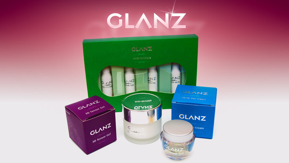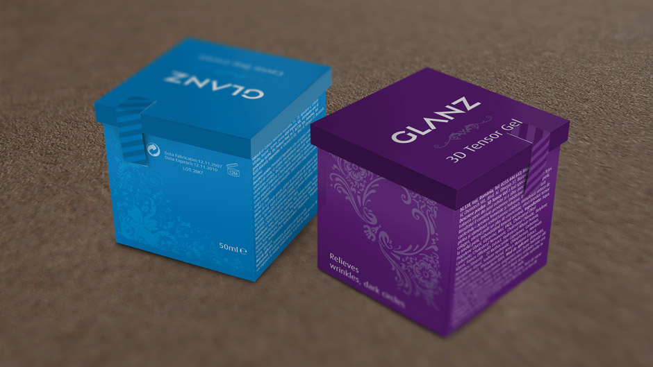 Für den rumänischen Mart haben wir GLANZ geschaffen. Eine junge Marke, die in einem ersten Schritt 3 Produkte vermarkten wird: 3D Tensor Gel, Caviar Day Cream und Anti-Wrinkle-Package (Anti-Falten-Paket). Wir haben ebenfalls das Verpackungsdesign der 3 Produkte entworfen.